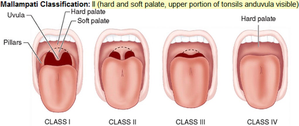 Mallampati scoring is used to evaluate a patient's airway for any potential difficulties that may be encountered when attempting intubation. This can be influenced by width of the mouth opening and the view of the soft pallet and other structures within the mouth. (Stutz and Rondeau, 2023)