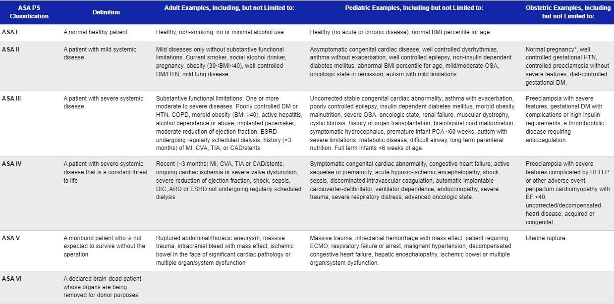 A common term within the perioperative field ASA (American Society of Anaesthesiologists) grading is used to give indications on the physical condition of any given patient. Developed in the 1940s to give clinicians a gauge of the risk being undertaken for each patient they encounter. (Kannan, 2017)
